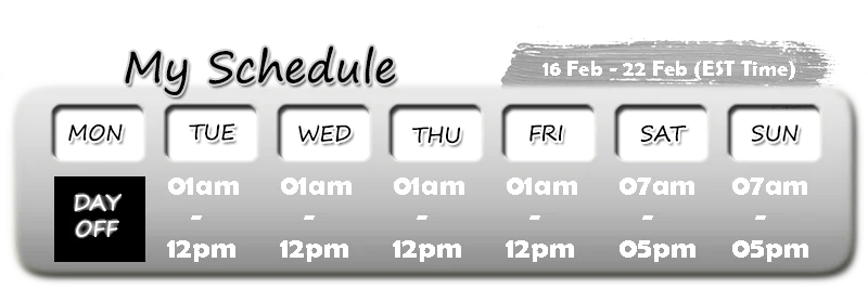 Esibizionismo, Flessioni, Sculacciate, Spogliarello, Feticismo dei piedi, Umiliazione, Masturbazione, Spettacolo con olio, Valutazione del cazzo, CEI, Sborrata, Ballo erotico, Eiaculazione, Hardcore, Orgasmo, Istruzioni per sborrare, Pompa, Pre-eiaculazione, SPH, Giochi di ruolo